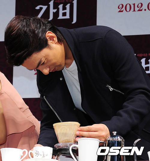 2일 오후 서울 압구정 CGV에서 열린 영화 '가비' 쇼케이스에서 주진모가 커피드립 시연을 선보이고 있다.