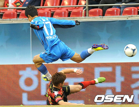 전반 울산 고슬기가 포항 김대호의 태클에 걸리고 있다.