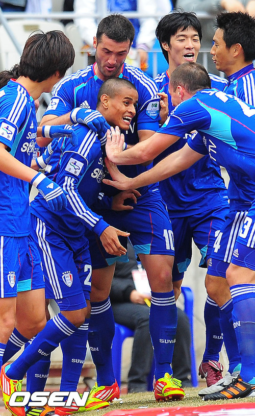4일 오후 수원월드컵경기장에서 열린 '현대오일뱅크 K리그 2012' 수원과 부산의 경기 전반 수원 에벨톤의 선취골에 라돈치치가 축하하고 있다.