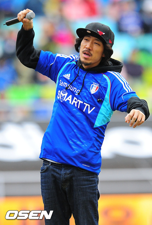 4일 오후 수원월드컵경기장에서 열린 '현대오일뱅크 K리그 2012' 수원과 부산의 경기 하프타임 타이거JK와 윤미래 부부가 축하무대를 펼치고 있다.