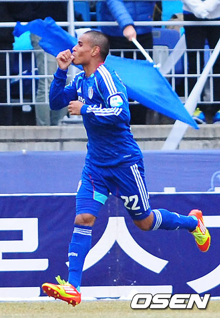 [OSEN=수원, 곽영래 인턴기자] 4일 오후 수원월드컵경기장에서 열린 '현대오일뱅크 K리그 2012' 수원과 부산의 경기 전반에 에벨톤 C가 데뷔 골을 넣고 세레모니를 펼치고 있다.