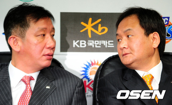 KCC 허재 감독과 울산 유재학 감독이 서로를 바라보며 이야기를 나누고 있다.