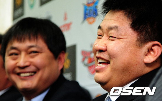 1위 원주 강동희 감독과 2위 KGC 이상범 감독이 미소 짓고 있다.