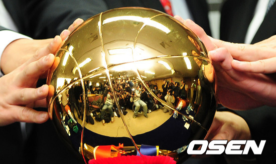 전자랜드 유도훈, KT 전창진, KGC 이상범, 원주 강동희, KCC 허재, 모비스 유재학 감독이 트로피에 손을 얹고 포토타임을하고 있다.