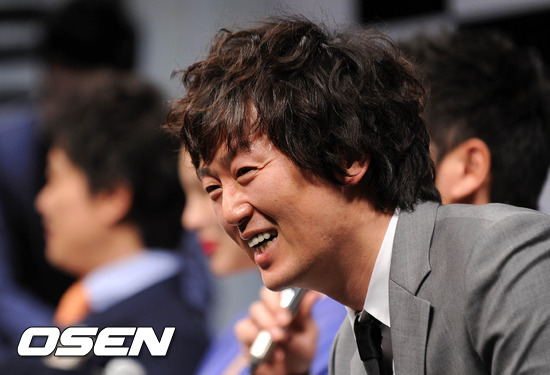 5일 오후 서울 압구정 CGV에서 열린 영화 '간기남'(감독 김형준) 제작보고회에서 배우 김정태가 주상욱의 말에 환하게 웃고 있다.