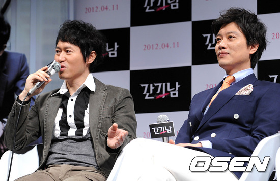 5일 오후 서울 압구정 CGV에서 열린 영화 '간기남'(감독 김형준) 제작보고회에서 김형준 감독이 배우 박희순을 칭찬하고 있다.