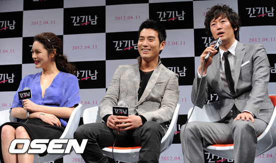 5일 오후 서울 압구정 CGV에서 열린 영화 '간기남'(감독 김형준) 제작보고회에서 배우 김정태의 말에 박시연, 주상욱이 환하게 웃고 있다.