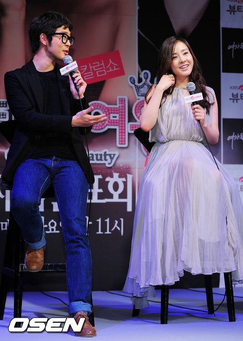 5일 오후 서울 강남구 역삼동 강남 노보텔 앰버서더 샴페인 홀에서 열린 KBS Drama '뷰티 칼럼쇼-뷰티의 여왕' 제작발표회에서 이켠이 박은혜를 칭찬하고 있다.