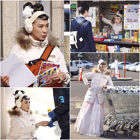 KBS 2TV 일일시트콤 ‘선녀가 필요해’에서 선녀 왕모 역할을 맡은 심혜진은 6일 공개된 사진에서 생업 전선에 뛰어든 모습을 하고 있다.
