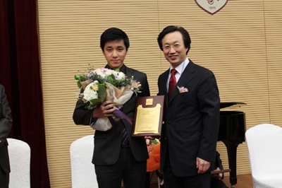 최준호 카페베네 R&D본부장(왼쪽)과 이두희 전 마케팅학회장(고려대 교수)이 마케팅 프론티어 대상 시상 후 기념 촬영을 하고 있다.