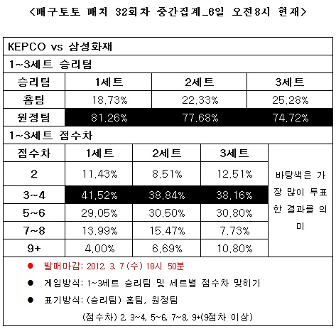 [배구토토] 국민체육진흥공단(www.kspo.or.kr)이 발행하는 체육진흥투표권 수탁사업자인 스포츠토토 공식 온라인 발매사이트 베트맨(www.betman.co.kr)이 오는 7일 오후 7시 수원실내체육관에서 열리는 KEPCO-삼성화재전 대상 배구토토 매치 32회차 게임 투표율을 중간집계한 결과, 국내 배구팬들은 선두 삼성화재의 승리를 전망했다고 전했다.