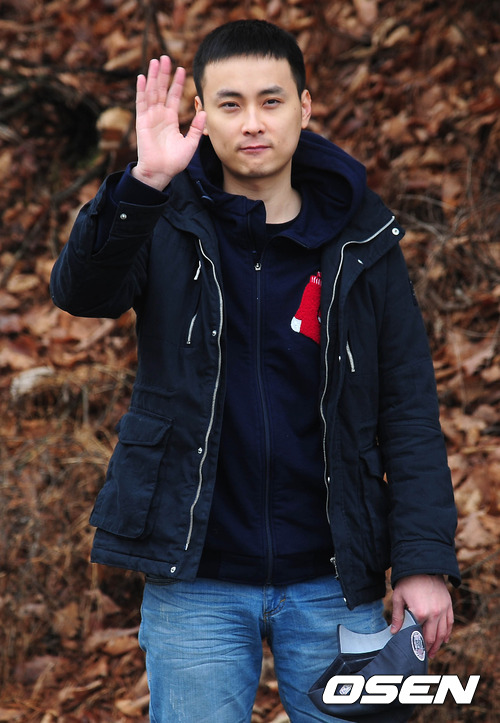 6일 오후 의정부 용현동 306보충대를 통해 입소하는 가수 민경훈이 훈련소 인근에서 취재진들을 향해 손을 흔들고 있다.