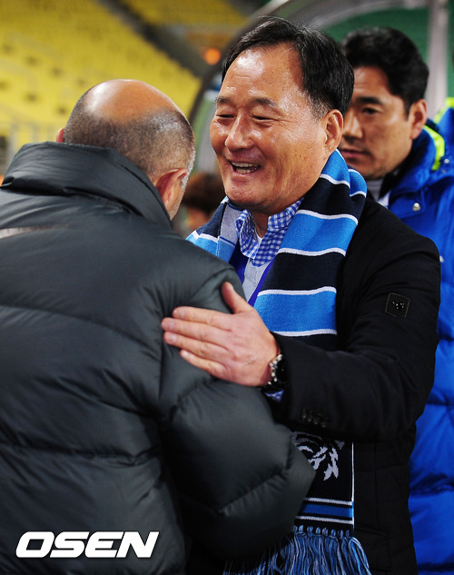 6일 저녁 울산 문수 축구경기장에서 열린 울산 현대와 베이징 궈안(중국)과의 '2012 아시아축구연맹(AFC) 챔피언스리그' F조 조별리그 1차전에서 현대 김호곤 감독과 베이징 하이메 모레이라 파체코 감독이 악수를 나누고 있다.