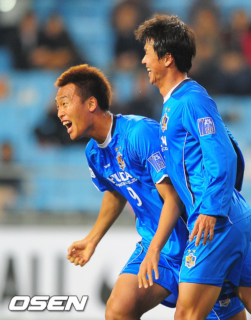 6일 저녁 울산 문수 축구경기장에서 열린 울산 현대와 베이징 궈안(중국)과의 '2012 아시아축구연맹(AFC) 챔피언스리그' F조 조별리그 1차전 전반 울산 김신욱이 선제골에 성공한 후 이호와 기쁨을 나누고 있다.