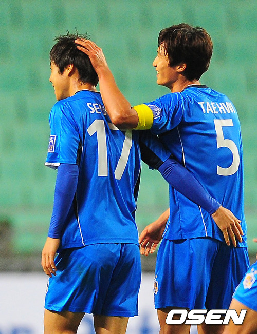 6일 저녁 울산 문수 축구경기장에서 열린 울산 현대와 베이징 궈안(중국)과의 '2012 아시아축구연맹(AFC) 챔피언스리그' F조 조별리그 1차전 전반 울산 고슬기가 팀 두번째 골을 성공시킨 후 곽태휘와 기쁨을 나누고 있다.