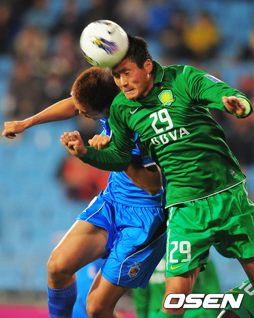 6일 저녁 울산 문수 축구경기장에서 열린 울산 현대와 베이징 궈안(중국)과의 '2012 아시아축구연맹(AFC) 챔피언스리그' F조 조별리그 1차전에서 울산 김신욱이 크로스를 헤딩슛으로 연결하려 하고 있다.