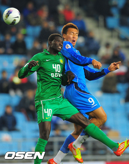 6일 저녁 울산 문수 축구경기장에서 열린 울산 현대와 베이징 궈안(중국)과의 '2012 아시아축구연맹(AFC) 챔피언스리그' F조 조별리그 1차전에서 김신욱이 헤딩슛을 시도하고 있다.
