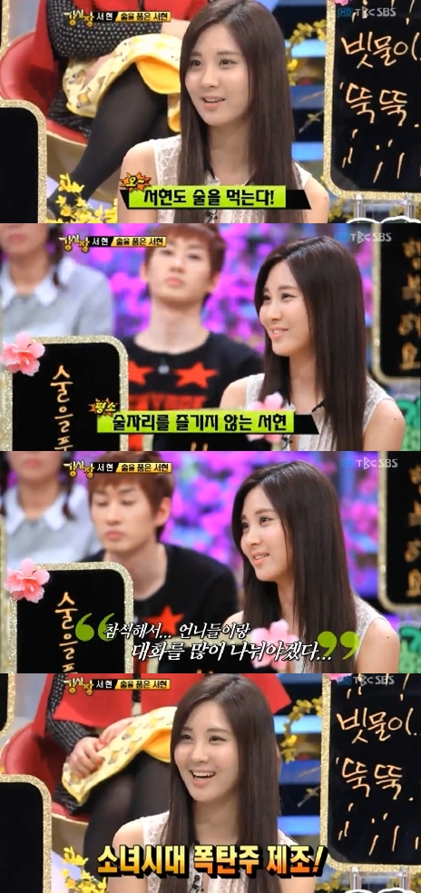 서현은 6일 방송된 SBS '강심장'에 출연해 "일본 콘서트를 마치고 소녀시대 멤버끼리 모여 술을 마신 적이 있다"며 "원래 술 마시는 분위기를 싫어하는 편인데 언니들과 많은 이야기를 나눌 수 있겠다 싶어서 참석했다"고 밝혔다.