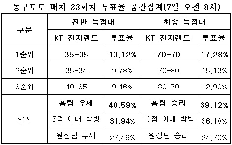 전반전에서는 KT 우세(40.59%)예상이 1순위로 집계됐고, 5점 이내 박빙(31.94%)예상과 전자랜드 우세(27.49%)예상이 뒤를 이었다. 전반득점대에서는 35-35점대 접전(13.12%)예상이 최다 집계됐고, 최종득점대에서는 70-70점대 접전(17.28%)예상이 가장 높게 나타났다.