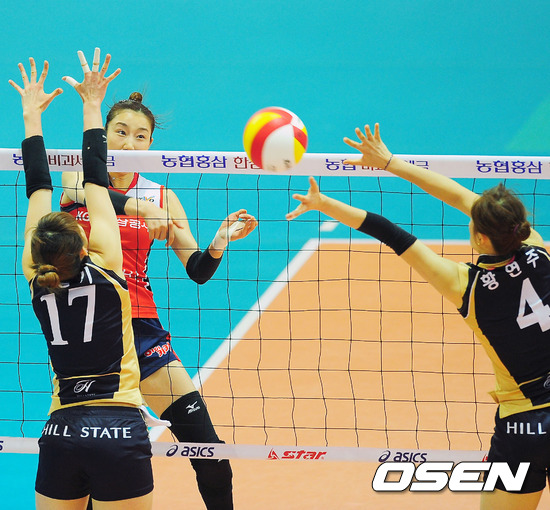 7일 오후 경기도 수원시 장안구 수원실내체육관에서 열린 'NH농협 2011-2012 V리그' 현대건설과 KGC인삼공사의 경기에서 KGC인삼공사의 한유미가 현대건설 박슬기와 황연주의 블로킹을 피해서 강타를 날리고 있다.