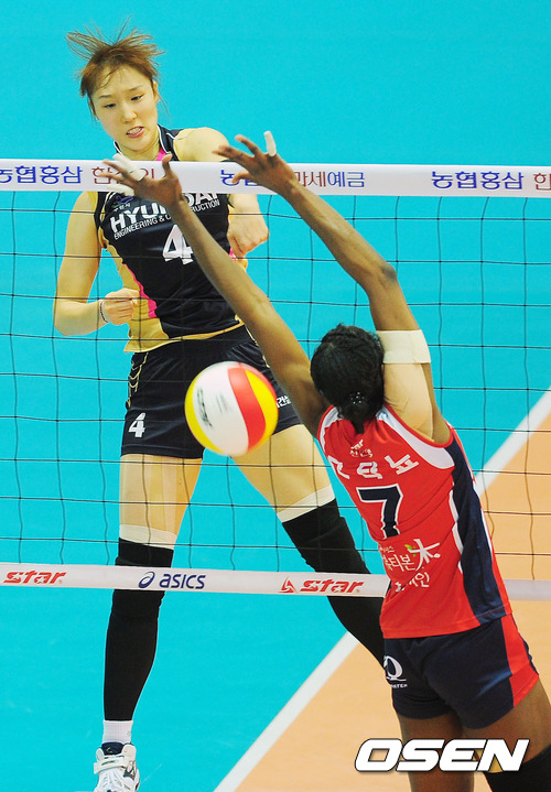 7일 오후 경기도 수원시 장안구 수원실내체육관에서 열린 'NH농협 2011-2012 V리그' 현대건설과 KGC인삼공사의 경기에서 현대건설 황연주가 KGC인삼공사의 몬타뇨의 블로킹을 피해 강타를 날리고 있다.