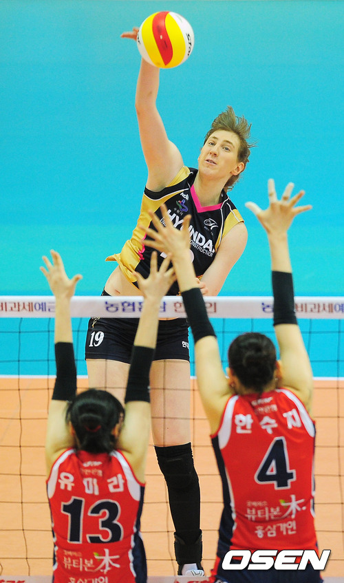 7일 오후 경기도 수원시 장안구 수원실내체육관에서 열린 'NH농협 2011-2012 V리그' 현대건설과 KGC인삼공사의 경기에서 현대건설 브란키차가 KGC인삼공사의 유미라 한수지의 블로킹을 피해 강타를 날리고 있다.