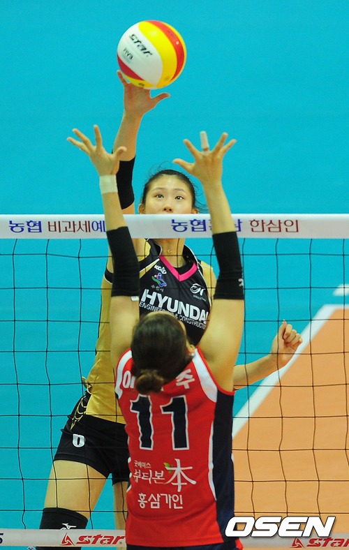 7일 오후 경기도 수원시 장안구 수원실내체육관에서 열린 'NH농협 2011-2012 V리그' 현대건설과 KGC인삼공사의 경기에서 현대건설 김수지가 연타를 날리고 있다.