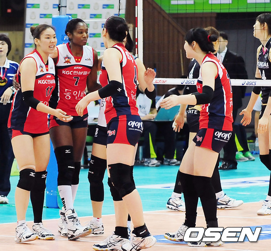 7일 오후 경기도 수원시 장안구 수원실내체육관에서 열린 'NH농협 2011-2012 V리그' 현대건설과 KGC인삼공사의 경기에서 이미 정규리그 우승을 확정지은 인삼공사가 '콜롬비아 특급' 몬타뇨(24득점)를 앞세워 세트스코어 3-0(25-20, 27-25, 25-22)으로 현대건설을 격파하며 현대건설의 연승행진에 제동을 걸었다.