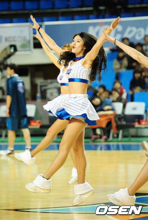 [OSEN=전주, 곽영래 인턴기자] 7일 저녁 전주 실내체육관에서 열린 전주 KCC와 울산 모비스의 2011-2012 프로농구 6강 플레이오프 1차전 작전 타임 때 치어리더들이 관중들에게 율동을 선사하고 있다.