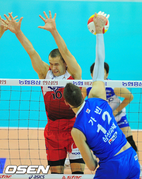 7일 오후 경기도 수원시 장안구 수원실내체육관에서 열린 'NH농협 2011-2012 V리그' KEPCO와 삼성화재의 경기에서 삼성화재 가빈이 강타를 날릴때 KEPCO 안젤코가 눈을 감고 있다.