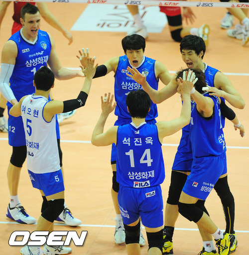 7일 오후 경기도 수원시 장안구 수원실내체육관에서 열린 'NH농협 2011-2012 V리그' KEPCO와 삼성화재의 경기에서 삼성화재 선수들이 공격에 성공한 후 기뻐하고 있다.