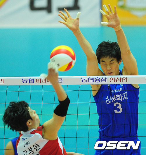 7일 오후 경기도 수원시 장안구 수원실내체육관에서 열린 'NH농협 2011-2012 V리그' KEPCO와 삼성화재의 경기에서 KEPCO 강성민이 강타를 날릴때 삼성화재 박철우가 블로킹을 하며 눈을 감고 있다.