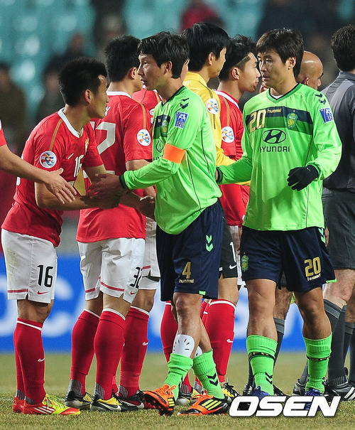 전북 현대는 7일 전주월드컵경기장에서 열린 2012 아시아축구연맹(AFC) 챔피언스리그 H조 조별리그 1차전 서 이장수 감독이 이끄는 광저우 헝다에 1-5로 완패했다. 전북은 이날 패배로 조 2위까지 16강전에 진출하는 ACL서 조별리그 통과를 낙관할 수 없게 됐다.