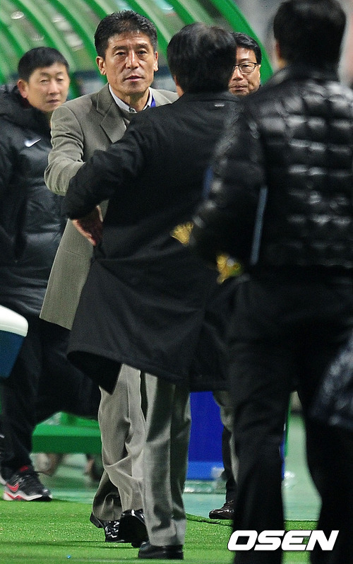 경기후 광저우 이장수 감독이 전북 이흥실 감독대행과 인사를 하고 있다./jpnews@osen.co.kr