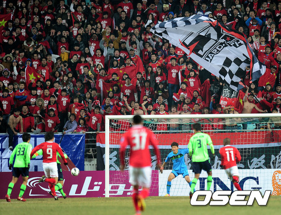 후반 광저우 원정 서포터즈가 열띤 응원을 선보이고 있다./jpnews@osen.co.kr