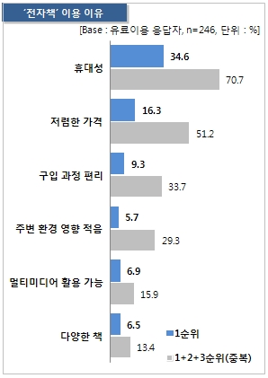 전자책 독서 경험자의 유료 전자책 이용 비중은 16.1%로 아직 미미한 수준이었다. 그러나 전자책 단말기 보유자의 경우 유료 이용률이 35.5%로 상대적으로 높은 특징을 보였다. 전자책 유료 이용자들은 휴대성(70.7%, 중복응답)과 저렴한 가격(51.2%), 구입 과정의 편리함(33.7%)을 전자책 이용이유로 꼽았으며, 주변 환경 영향이 적다는 응답(29.3%)도 많은 편이었다.