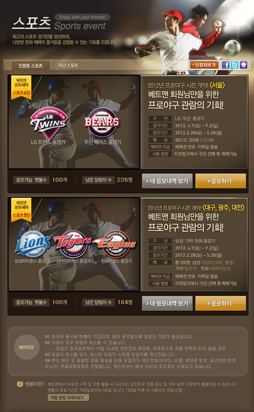 이번 이벤트는 오는 5월 28일까지 서울, 대구, 광주, 대전의 스포츠토토 회원들을 대상으로 진행되며, 벳볼 100개 이상을 보유한 회원은 누구나 응모가 가능하다. 당첨된 회원에게는 4월 7일부터 9월 2일까지 열리는 LG/두산(서울), 삼성/기아/ 한화(대구, 광주, 대전)의 경기 중 자신이 응원하는 팀의 홈 경기를 관람할 수 있는 티켓이 증정된다.