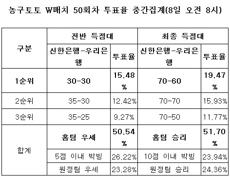 국민체육진흥공단(www.kspo.or.kr)이 발행하는 체육진흥투표권 수탁사업자인 스포츠토토의 공식 온라인 발매 사이트 베트맨(www.betman.co.kr)이 오는 9일 오후 5시 안산와동체육관에서 벌어지는 신한은행-우리은행전 대상 농구토토 W매치 50회차 게임 투표율을 중간 집계한 결과, 전체 참가자의 51.70%는 신한은행의 승리를 예상했다고 전했다.
