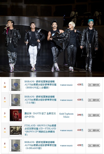 빅뱅은 이번 새 앨범으로 대만의 온라인 음반 판매 사이트 '북스 닷컴' 앨범 차트 1위를 기록했다.
