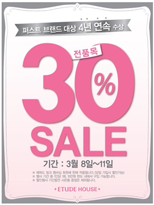 메이크업 전문 브랜드 에뛰드하우스(www.etude.co.kr)는 8일부터 11일까지 4일간 전 품목 30% 할인 판매한다.