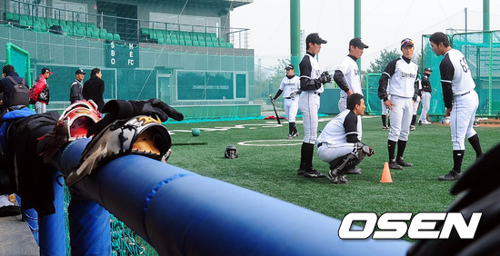 8일 오후 고양시 고양국가대표 야구훈련장에서 열린 고양 원더스와 LG 2군의 평가전 경기 시작 전 원더스 선수들이 훈련중 이야기를 나누고 있다.