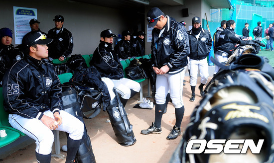 8일 오후 고양시 고양국가대표 야구훈련장에서 열린 고양 원더스와 LG 2군의 평가전 경기 시작 전 고양 원더스 선수들이 덕아웃에 앉아 있다.