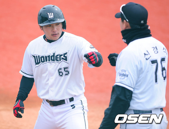 8일 오후 고양시 고양국가대표 야구훈련장에서 열린 고양 원더스와 LG 2군의 평가전 경기 1말 1사 원더스 조성원이 좌전안타를 친 후 1루 신경식 코치와 하이파이브를 하고 있다.