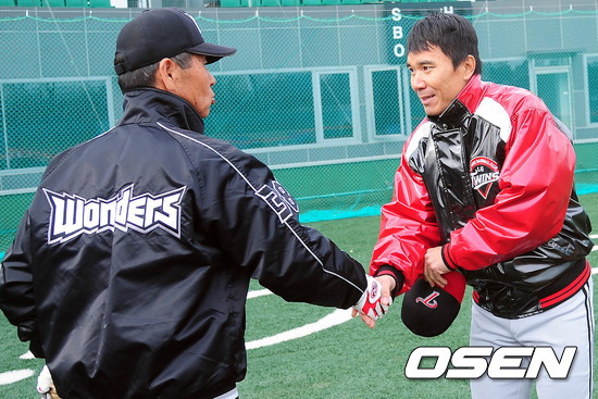 8일 오후 고양시 고양국가대표 야구훈련장에서 열린 고양 원더스와 LG 2군의 평가전 경기 종료 후 고양 원더스 김성근 감독과 LG 이대진이 악수를 나누고 있다.