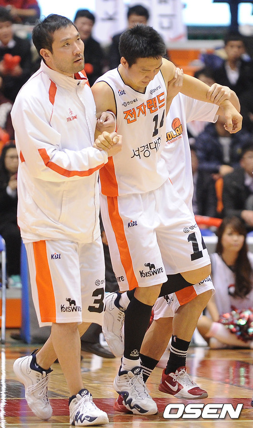 8일 오후 부산 사직실내체육관서 열린 '2011-2012 KB국민카드 프로농구' 6강 플레이오프 1차전 부산 KT와 인천 전자랜드의 경기 4쿼터 전자랜드 이현호가 부상으로 부축받으며 코트를 빠져나가고 있다