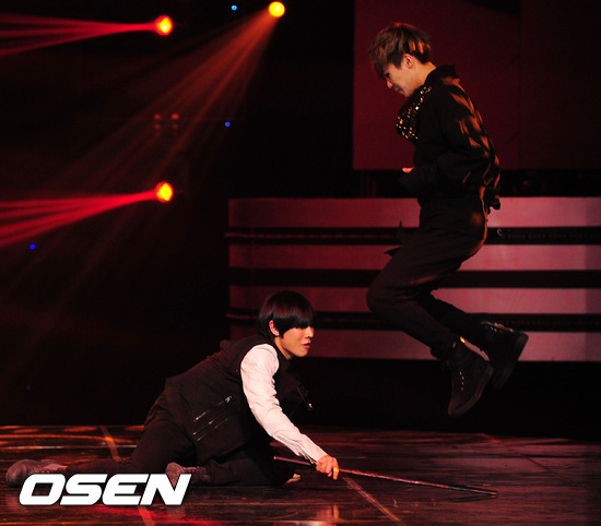 8일 오후 서울 상암동 CJ E&M센터에서 생방송으로 진행된 케이블 채널 Mnet ‘엠 카운트다운’(이하 엠카)에서 엠블랙의 이준이 사전녹화 이후의 무대에서 천둥에게 목도를 휘두르고 있다.