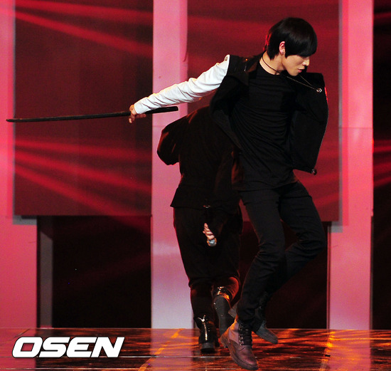 8일 오후 서울 상암동 CJ E&M센터에서 생방송으로 진행된 케이블 채널 Mnet ‘엠 카운트다운’(이하 엠카)에서 엠블랙의 이준이 지오에게 목도를 휘두르고 있다.