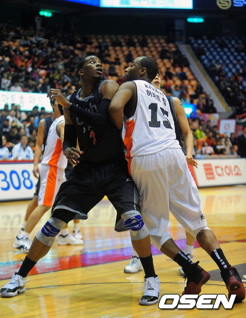 [OSEN=부산,정송이 인턴기자] 8일 오후 부산 사직실내체육관서 열린 '2011-2012 KB국민카드 프로농구' 6강 플레이오프 1차전 부산 KT와 인천 전자랜드의 경기 1쿼터 로드와 허벝 힐이 골밑에서 몸싸움을 벌이고 있다.