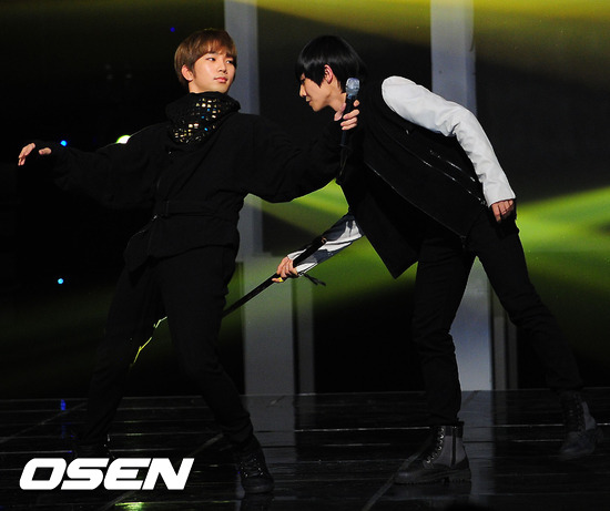 8일 오후 서울 상암동 CJ E&M센터에서 생방송으로 진행된 케이블 채널 Mnet ‘엠 카운트다운’(이하 엠카)에서 엠블랙의 이준이 사전녹화 이후의 무대에서 지오에게 목도를 휘두르고 있다.