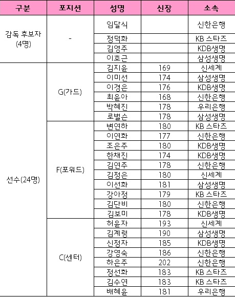 이번 예비엔트리에는 4명의 후보 감독과 함께 가드 6명, 포워드 10명, 센터 8명의 선수 24명이 포함됐다. 최종엔트리와 감독은 WKBL 2011-2012시즌이 끝난 뒤 발표될 예정이다.